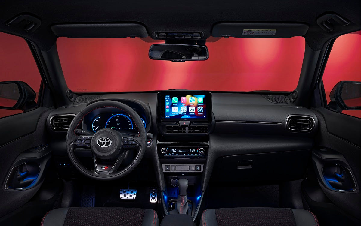 Στο εσωτερικό συναντάμε σπορ καθίσματα, νέες επενδύσεις με κόκκινες ραφές και μεταλλικά ένθετα στο διάκοσμο, ενώ ο εξοπλισμός είναι πλούσιος με στάνταρ διζωνικό κλιματισμό, θερμαινόμενα εμπρός καθίσματα και το πακέτο τεχνολογιών υποβοήθησης του οδηγού Toyota T-Mate.