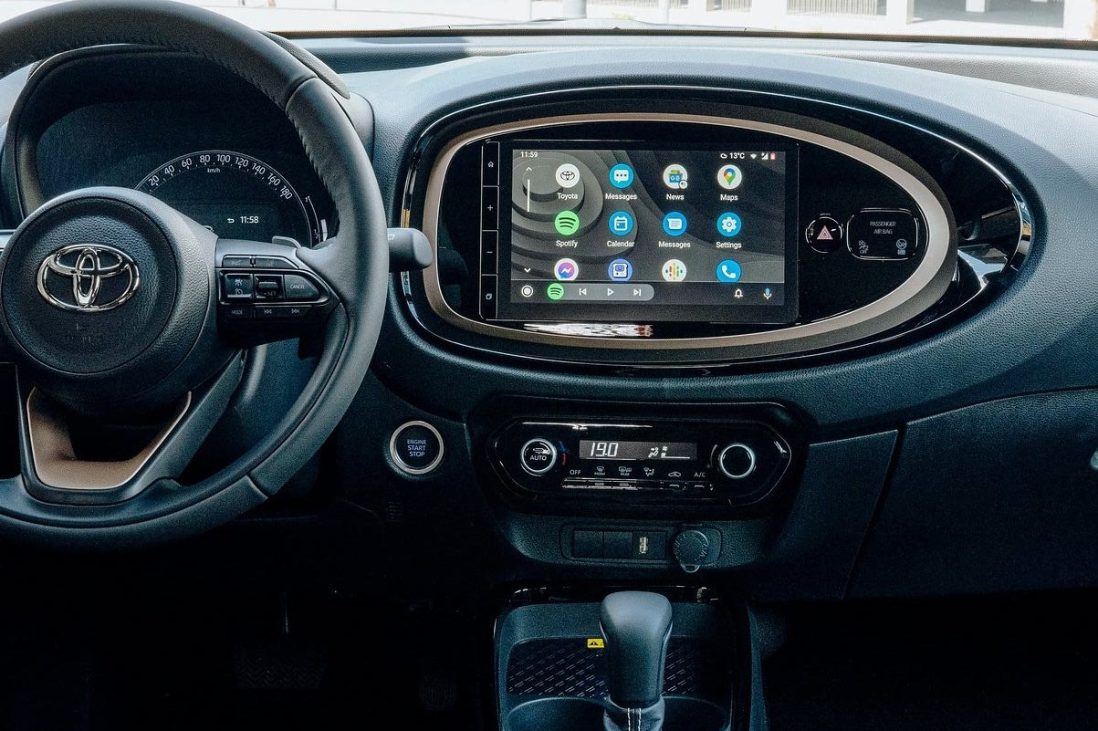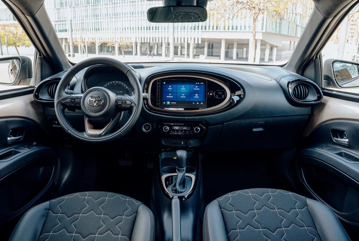 Το εσωτερικό του Aygo X θυμίζει περισσότερο το προηγούμενο μοντέλο, τόσο σε αισθητική όσο και χωροταξικά. Ολόκληρο το κεντρικό τμήμα του ταμπλό είναι έτσι διαμορφωμένο ώστε να φιλοξενείται η οθόνη του infotainment (στάνταρ 7’’ ή 9’’ στις πλουσιότερες εκδόσεις).