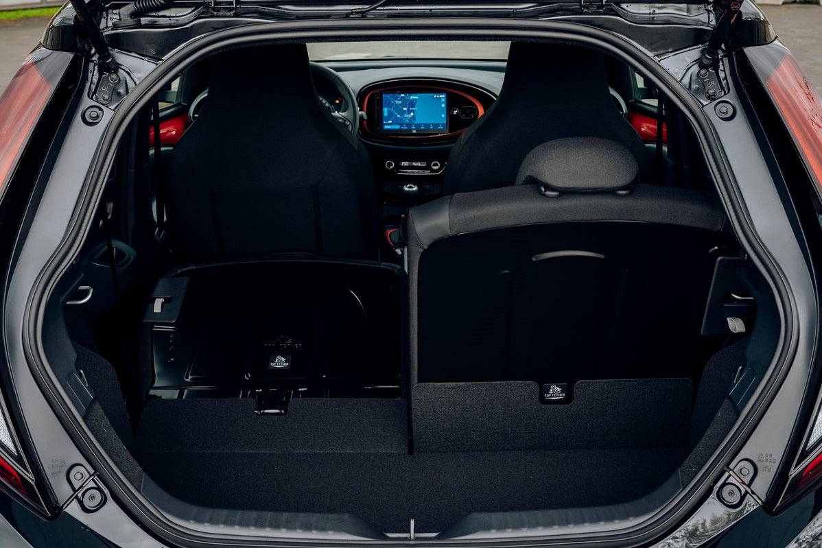 Οι χώροι δεν συγκαταλέγονται στα πλεονεκτήματα του Aygo X. Είναι απλώς επαρκείς για τέσσερις επιβάτες και αποσκευές (231 λίτρα) και υστερούν εμφανώς του κορυφαίου ανταγωνισμού (βλέπε Picanto, i10).
