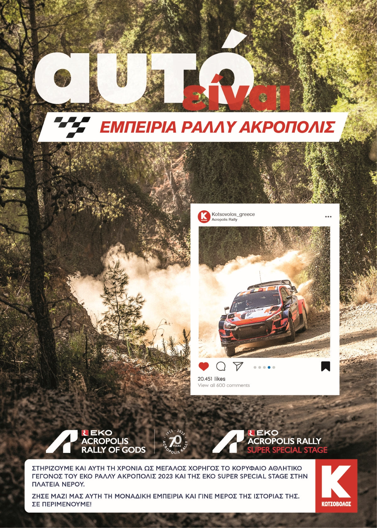 Ως Μέγας Χορηγός αυτού του διεθνούς αναγνωρισμένου αγώνα, απόλυτα ταυτισμένου με τη Ελλάδα, η Κωτσόβολος έχει ετοιμάσει μια σειρά από δράσεις, με διαγωνισμούς και εξαιρετικά ενδιαφέροντα δώρα, προκειμένου να σου δώσει την ευκαιρία να ζήσεις την απόλυτη εμπειρία στο φετινό ΕΚΟ Ράλλυ Ακρόπολις. Σε αυτό το πλαίσιο του εορτασμού των 70 ετών παρουσίας στην Ελλάδα, τόσο για το Ράλλυ Ακρόπολις, όσο και για την Κωτσόβολος, αναδεικνύεται και το κοινό χαρακτηριστικό των δύο, που δεν είναι άλλο από τη δημιουργία των πιο συναρπαστικών εμπειριών μέσα από τον μηχανοκίνητο αθλητισμό και την τεχνολογία.