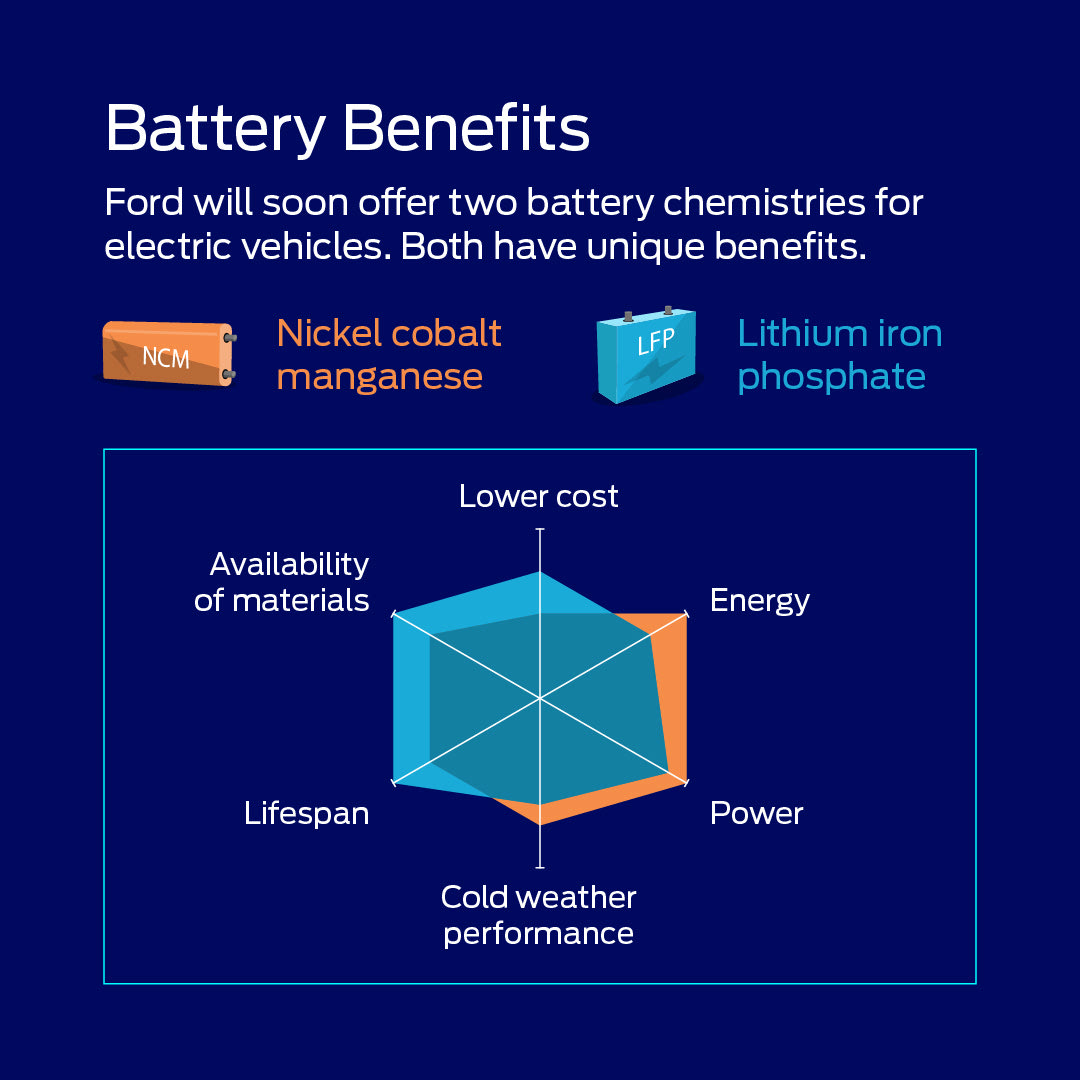 Η Ford πρόκειται να επενδύσει 3,5 δισεκατομμύρια δολάρια για την κατασκευή του πρώτου εργοστασίου μπαταριών LFP στις ΗΠΑ – που φέρει την ονομασία BlueOval Battery Park Michigan – το οποίο θα λειτουργήσει το 2026. Άλλωστε, η Ford έχει δεσμευτεί αφενός να επενδύσει πάνω από 50 δισεκατομμύρια δολάρια σε ηλεκτρικά οχήματα σε παγκόσμιο επίπεδο μέχρι το 2026, αφετέρου να επιτύχει ουδετερότητα άνθρακα παγκοσμίως σε όλα τα οχήματα, τις δραστηριότητες και την εφοδιαστική αλυσίδα της μέχρι το 2050.
