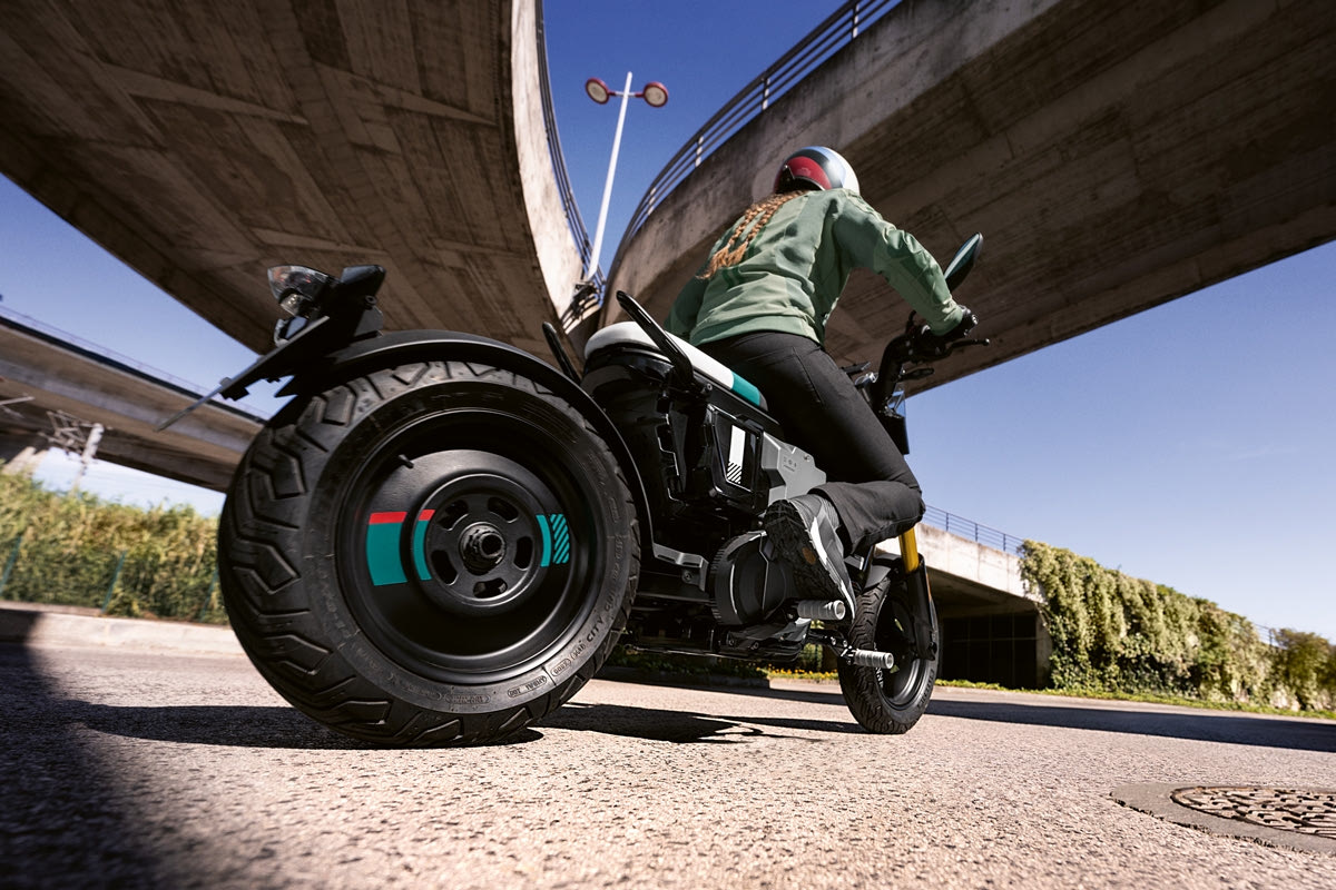 Τα φαρδιά ελαστικά είναι τοποθετημένα σε χυτούς τροχούς ελαφρού κράματος που θυμίζουν δισκόπλακες, ενώ τα δισκόφρενα εξασφαλίζουν ασφαλή επιβράδυνση εμπρός και πίσω. Το ABS της BMW Motorrad διαθέτει ABS στον εμπρός τροχό. Μία ευανάγνωστη οθόνη TFT ενημερώνει τον οδηγό για την ταχύτητα οδήγησης, την κατάσταση φόρτισης της μπαταρίας και πολλά ακόμα.