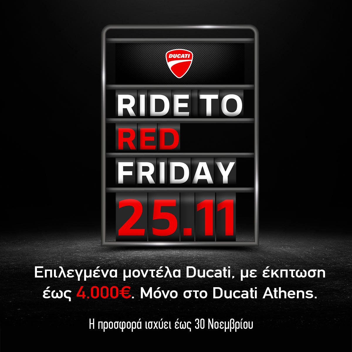 Τα 4.000 ευρώ φτάνει η έκπτωση για δημοφιλή μοντέλα της Ducati. Όπως λέει η επίσημη ανακοίνωση, το Ducati Athens δίνει έντονο κόκκινο χρώμα στη Black Friday έτσι ώστε οι φανατικοί φίλοι της Ducati να αποκτήσουν τη μοτοσυκλέτα των ονείρων τους, και να βγούνε κερδισμένοι από τις ειδικές τιμές που ισχύουν σε κορυφαία μοντέλα.