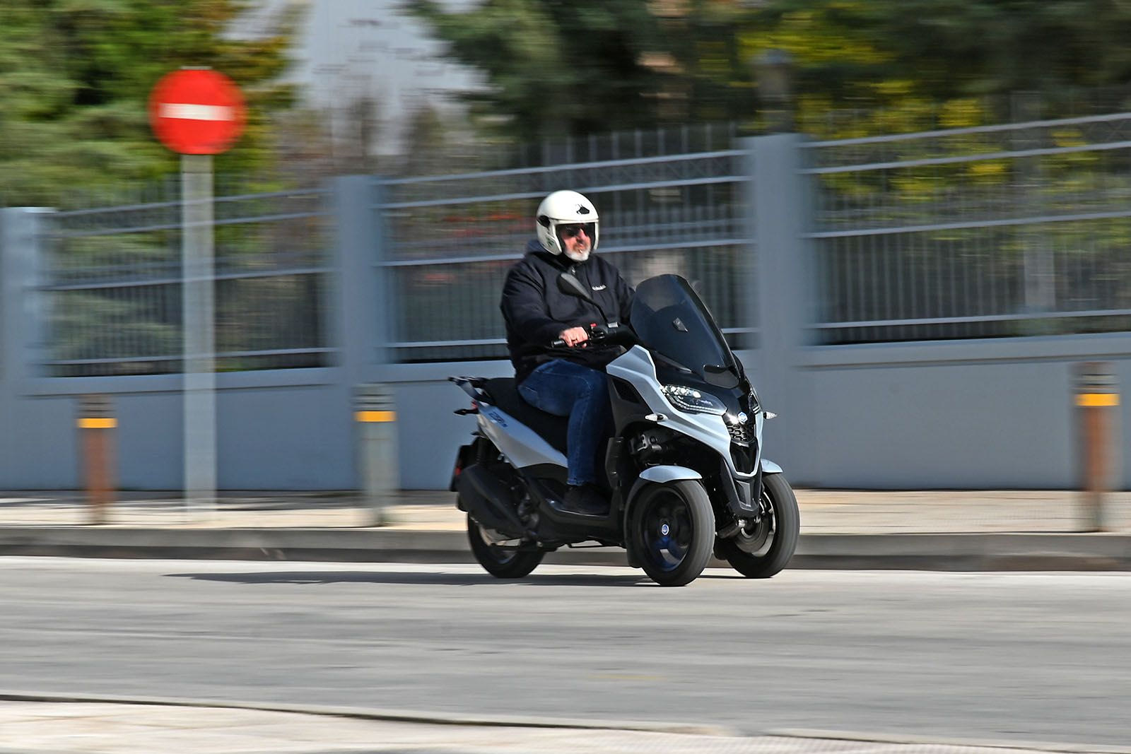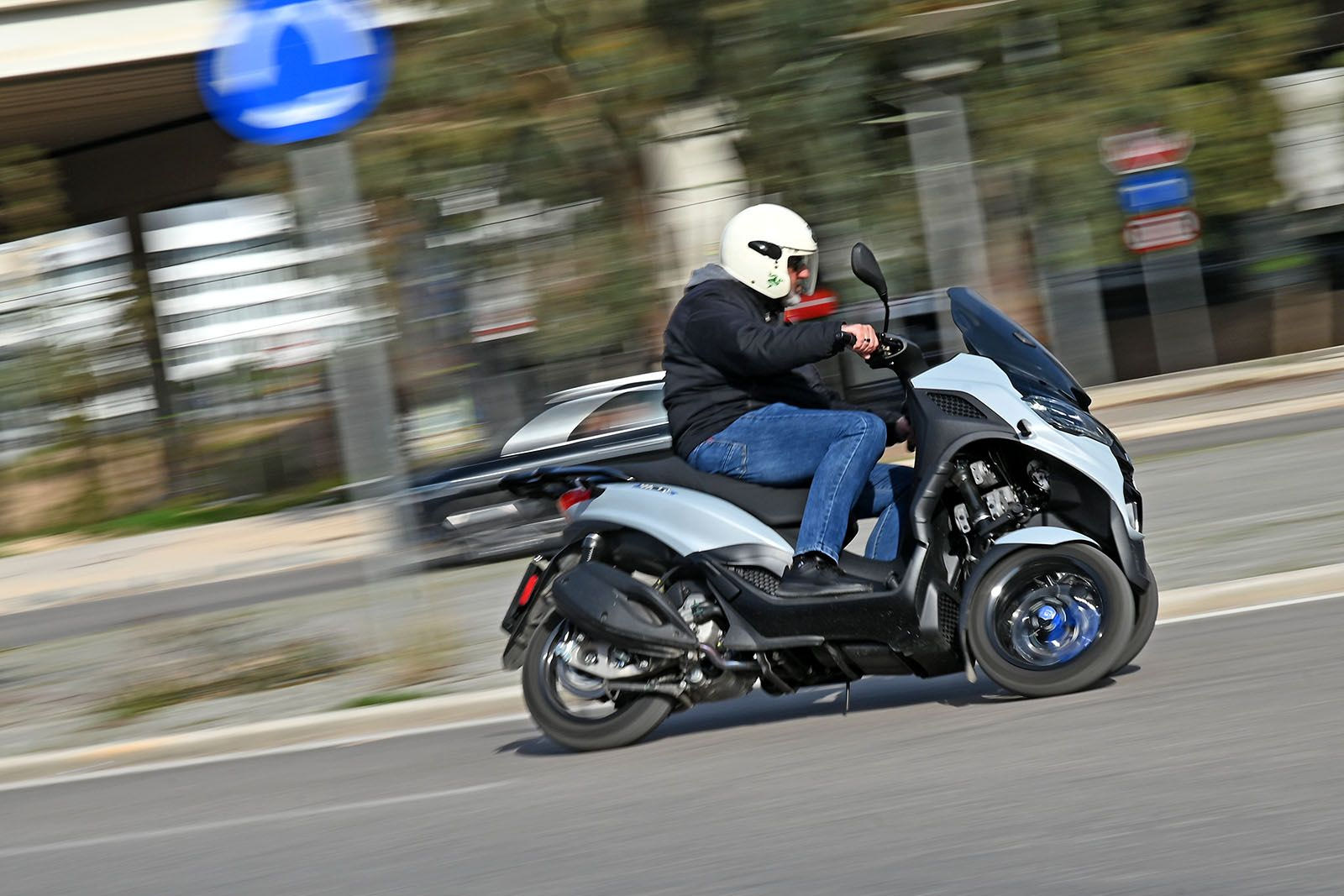 Παρότι πιο ογκώδες στο εμπρός μέρος του, το MP3 (χάρη στην ανεξάρτητη ανάρτηση των μπροστινών τροχών) δεν χάνει -ή χάνει ανεπαίσθητα- την ευελιξία ενός κλασσικού δίτροχου σκούτερ, τόσο εν κινήσει όσο και στους ελιγμούς εν στάσει.