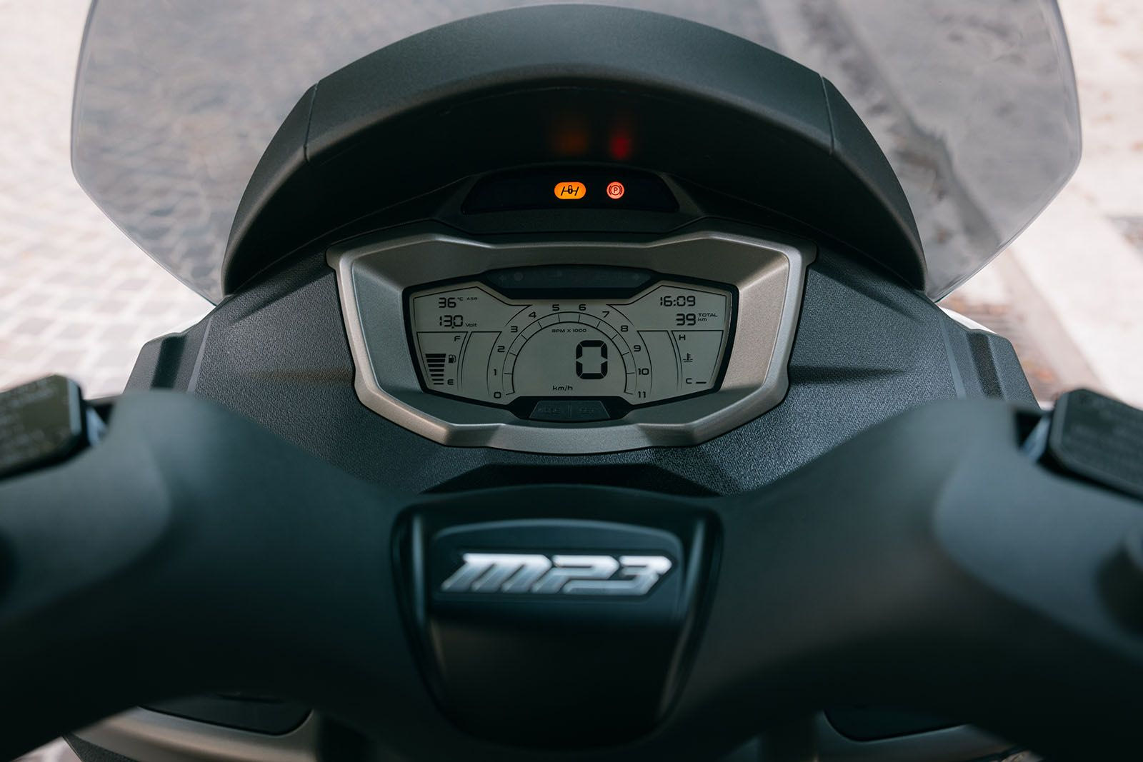 Ο αναβάτης επίσης μπορεί να δει πληροφορίες όπως τη μέγιστη/μέση ταχύτητα, τη στιγμιαία/μέση κατανάλωση, την τάση και το επίπεδο φόρτισης της μπαταρίας – ενώ οι προειδοποιητικές λυχνίες παρακολουθούν τον ψεκασμό, τη ρεζέρβα, την πίεση λαδιού, το ABS και το immobilizer.