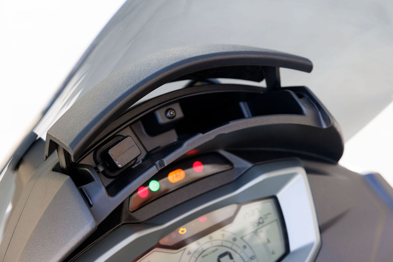 Πάνω από τον πίνακα οργάνων υπάρχει ένα πρακτικό ντουλαπάκι με συρτάρι και θύρα USB, για τη φόρτιση του smartphone, ενώ ιδιαίτερα πρακτικό στην καθημερινότητα είναι το σύστημα Keyless, το οποίο επιτρέπει την ενεργοποίηση της ανάφλεξης, το άνοιγμα της σέλας και της τάπας του ρεζερβουάρ, καθώς και το κλείδωμα του τιμονιού, χωρίς τη χρήση του συμβατικού κλειδιού – απλά με ένα πρακτικό κουμπί.