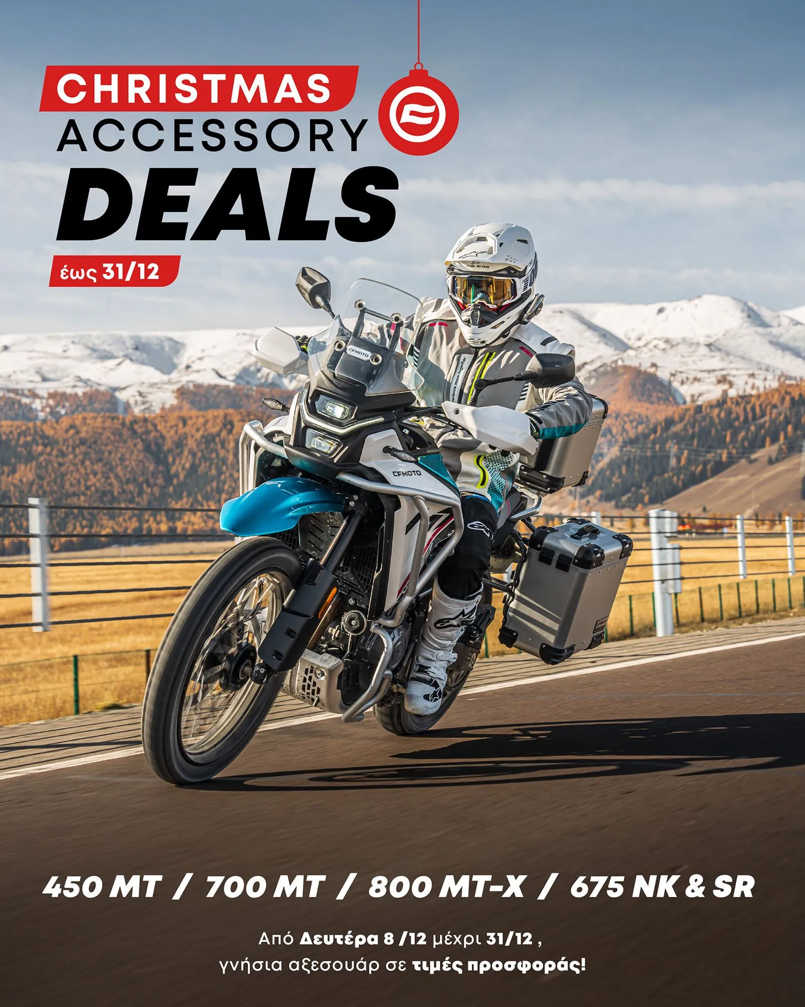 Η CF MOTO ανακοίνωσε μια νέα προωθητική ενέργεια, για ολόκληρο το φετινό Δεκέμβριο: την έκπτωση 30% σε επιλεγμένα αξεσουάρ μιας σειράς μοτοσικλετών.