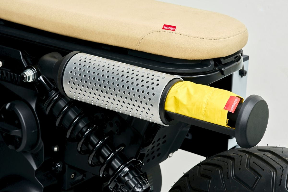 Έτσι δημιουργείται χώρος για μια ομπρέλα. Σχεδιαστικά στοιχεία, όπως μαρσπιέ με grip tapes για skateboard, αντικατοπτρίζει ένα σπορ, αστικό eParkourer στυλ. Η BMW Motorrad και η VAGABUND δημιουργούν για μια ακόμα φορά την απόλυτη πρόταση custom μοτοσικλέτας με ειδική “συσκευασία” για την στάθμευση, που έχει ύψος 3,6 m και ολοκληρώνει με τρόπο μοναδικό τη συνολική φιλοσοφία της.