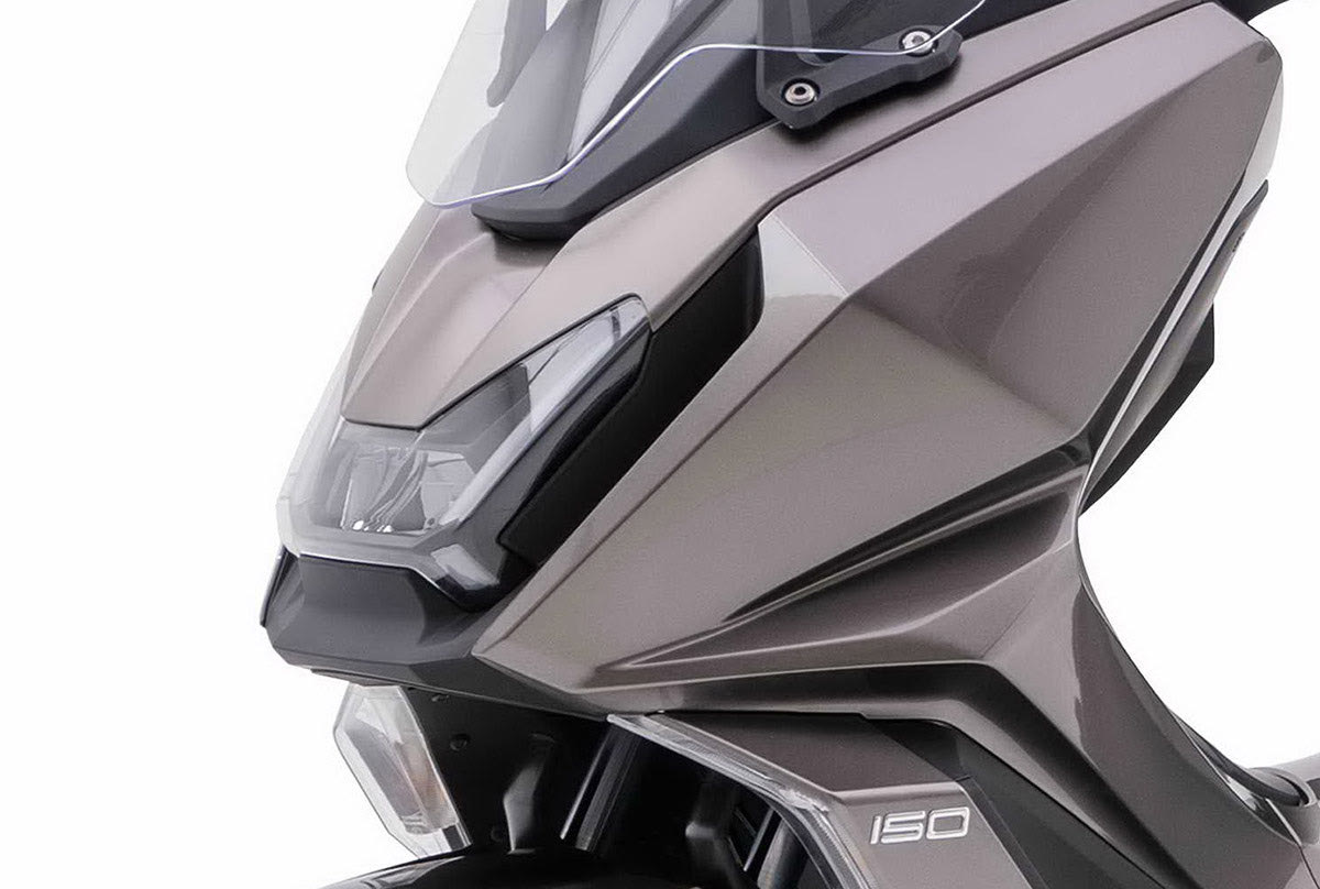 Το μπροστινό μέρος του Sky Town διαθέτει έντονες γραμμές και η συνολική σχεδίαση αναδεικνύει έναν δυναμικό χαρακτήρα, ο οποίος υπογραμμίζεται από τον ενσωματωμένο στην ποδιά διπλό προβολέα LED. Για μέγιστη αεροδυναμική προστασία είναι εξοπλισμένο με μεγάλο ανεμοθώρακα για την καλύτερη δυνατή προστασία από τα καιρικά φαινόμενα και την απρόσκοπτη πολύωρη οδήγηση.