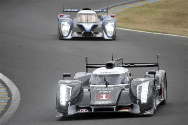The Audi R18 TDI No1 driven by French driver Romain Dumas, Timo Bernhard and Mike Rockenfeller both of Germany is seen in action ahead of the Peugeot No9 driven by Sebastien Bourdais, Simon Pagenaud, both of France, and Pedro Lamy of Portugal at the start of the 79th 24-hour Le Mans endurance race, in Le Mans, western France, Saturday, June 11, 2011. (AP Photo/Vincent Michel)