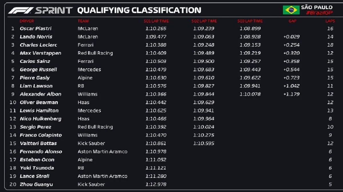Κάτω από τον απειλητικό ουρανό του Σάο Πάουλο, που όμως δεν άνοιξε ποτέ (κρατώντας το Sprint Qualifying στεγνό) το επίτευγμα του Πιάστρι ήταν ακόμα πιο εντυπωσιακό αν υπολογίσουμε ότι κέρδισε τον Νόρις στο δεύτερο γρήγορο γύρο με το ένα και μόνο σετ μαλακής γόμας του SQ3.