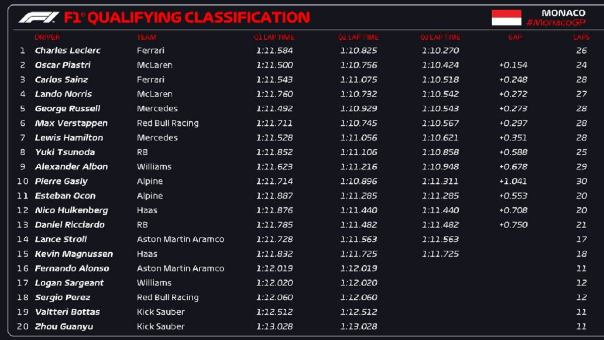 Με έναν άρτιο γύρο στην εκπνοή των δοκιμών κατάταξης του GP του Μονακό ο Σαρλ Λεκλέρ κατέκτησε την πρώτη θέση της εκκίνησης για τον αγώνα της πατρίδας του με την κυρίαρχη Ferrari SF-24, εμπρός από τον εξίσου εντυπωσιακό Όσκαρ Πιάστρι της McLaren. Ο Φερστάπεν στη μπαριέρα στον τελευταίο του γύρο, έμεινε στην 6η θέση της εκκίνησης.