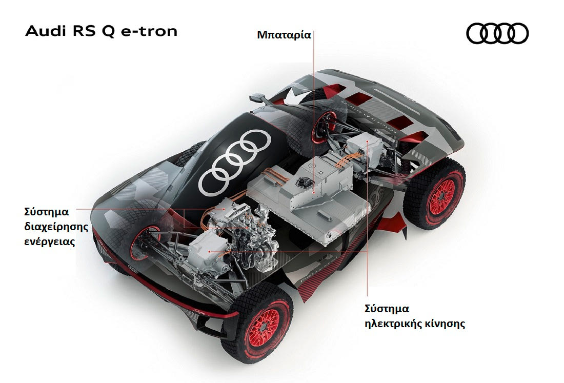Το Audi RS Q e-tron διαθέτει ηλεκτρικό σύστημα μετάδοσης με μετατροπέα ενέργειας. Αποτελείται από έναν κινητήρα εσωτερικής καύσης και μια γεννήτρια, καθώς και από μια μπαταρία υψηλής τάσης και δύο ηλεκτροκινητήρες – έναν στον μπροστινό και έναν στον πίσω άξονα.