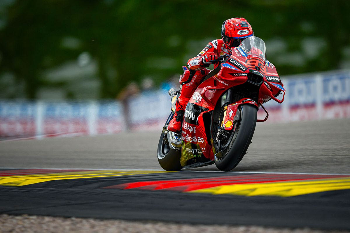 O πρωτοπόρος του πρωταθλήματος του MotoGP, Μαρκ Μάρκεζ, κατέκτησε με την εργοστασιακή Ducati άλλη μία πολ ποζίσιον -για το GP της Γερμανίας- στη βρεγμένη άσφαλτο της πίστας της Σαξονίας, με ενάμισι δέκατο διαφορά από τον Ζοάν Ζαρκό της LCR Honda.