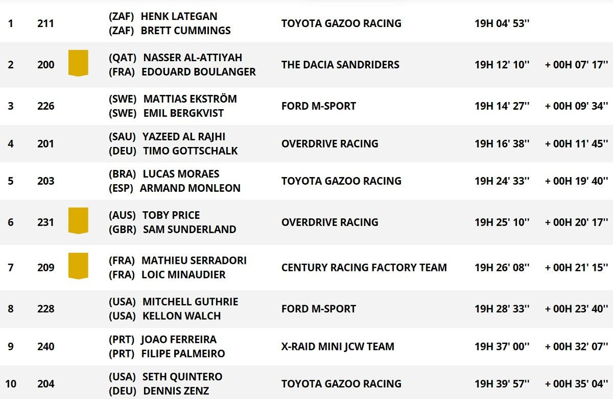 Ο Κιντέρο εντέλει έπεσε στην 4η θέση στον τερματισμό, 1’:48’’ πίσω από τον Βαριάουα, ανάμεσα στα άλλα δύο Mini της X-Raid, με οδηγούς τους Γκιγιόμ ντε Μέβιους και Ζοάο Φερέιρα. Ο Αλ Ατίγια, με το εργοστασιακό Dacia Sandrider, δεν ήταν σε θέση να ακολουθήσει το ρυθμό των Toyota και Mini και έγραψε τον 6ο χρόνο, χάνοντας τριάμισι λεπτά από τον Βαριάουα.