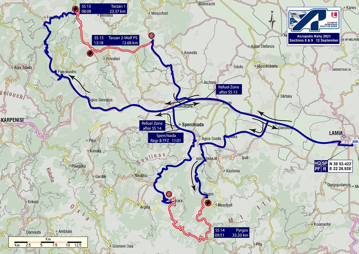 Η ΕΔ “Ταρζάν” θα διεξαχθεί το πρωί, θα ακολουθήσει ένα πέρασμα από την ΕΔ Πύργος, νοτιότερα, και έπειτα τα πληρώματα θα γυρίσουν στην πρώτη για τη διεξαγωγή της Power Stage – που βραβεύει τους πέντε πρώτους οδηγούς με 5-4-3-2-1 βαθμούς, αντίστοιχα. Για την τελευταία Power Stage οι αγωνιζόμενοι θα εκκινήσουν από διαφορετικό σημείο, καθώς στην επανάληψή της η ΕΔ Ταρζάν θα περιοριστεί στα 12,68 χιλιόμετρα. Στο τέλος της, στο γήπεδο της Παλαιάς Γαννιτσούς θα γίνει η απονομή, πριν τα αυτοκίνητα επιστρέψουν στη Λαμία για τον τερματισμό.