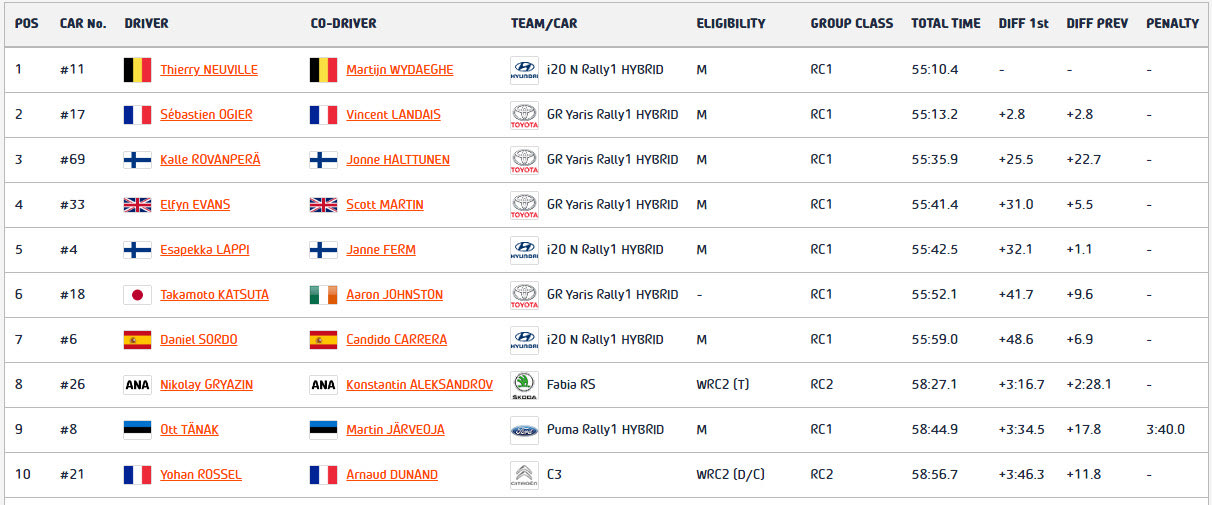 Τον πρώτο χρόνο και στις δύο απογευματινές Ειδικές πέτυχε ο Οτ Τάνακ της M-Sport Ford, αξιοποιώντας την καλή του θέση στη σειρά εκκίνησης ειδικά στα στενά τμήματα του δρόμου, προσπαθώντας να καλύψει λίγο από το χαμένο έδαφος από το “καπέλο” 3:40 λεπτών που δέχθηκε μετά τα Πίσσια λόγω προβλήματος στην τρόμπα νερού του Ford Puma Rally1.
