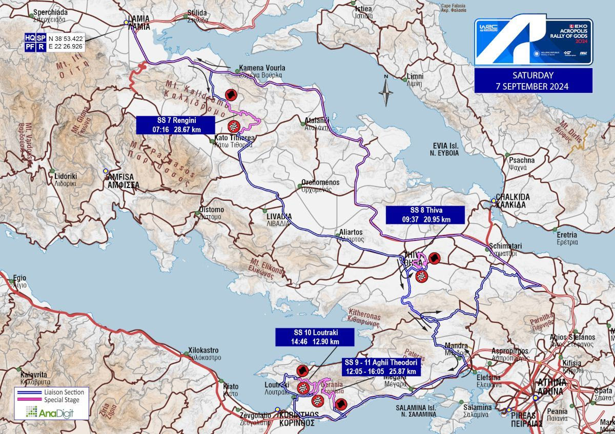 Μετά τα δύο loops της πρώτης ημέρας στα δυτικά της Λαμίας, οι αγωνιζόμενοι του ΕΚΟ Ράλλυ Ακρόπολις το Σάββατο (7/9) θα κινηθούν προς τα νότια για την ΕΔ Ρεγκίνι μεταξύ της Οίτης και του όρους Καλλίδρομου, την ΕΔ της Θήβας, τις ΕΔ των Αγ. Θεοδώρων και του Λουτρακίου στην Κορινθία, και τέλος για την Υπερειδική στο ΣΕΑ Σείριος της Μαλακάσας.