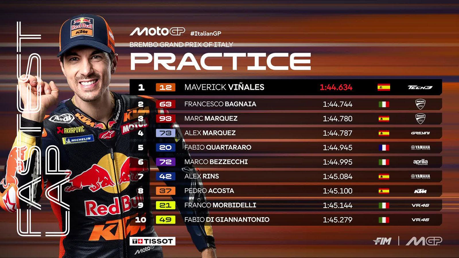 Ο Μάβερικ Βινιάλες “πέταξε” στην κορυφή με έναν χρόνο-έκπληξη με την Tech3 KTM στο τέλος των χρονομετρημένων ελεύθερων δοκιμών του MotoGP Ιταλίας, με ένα δέκατο διαφορά από τον Πέκο Μπανάια της Ducati -Έπεσε, έβγαλε τον ώμο του, αλλά γύρισε για να γράψει τον 5ο χρόνο ο Φάμπιο Κουαρταραρό της Yamaha.