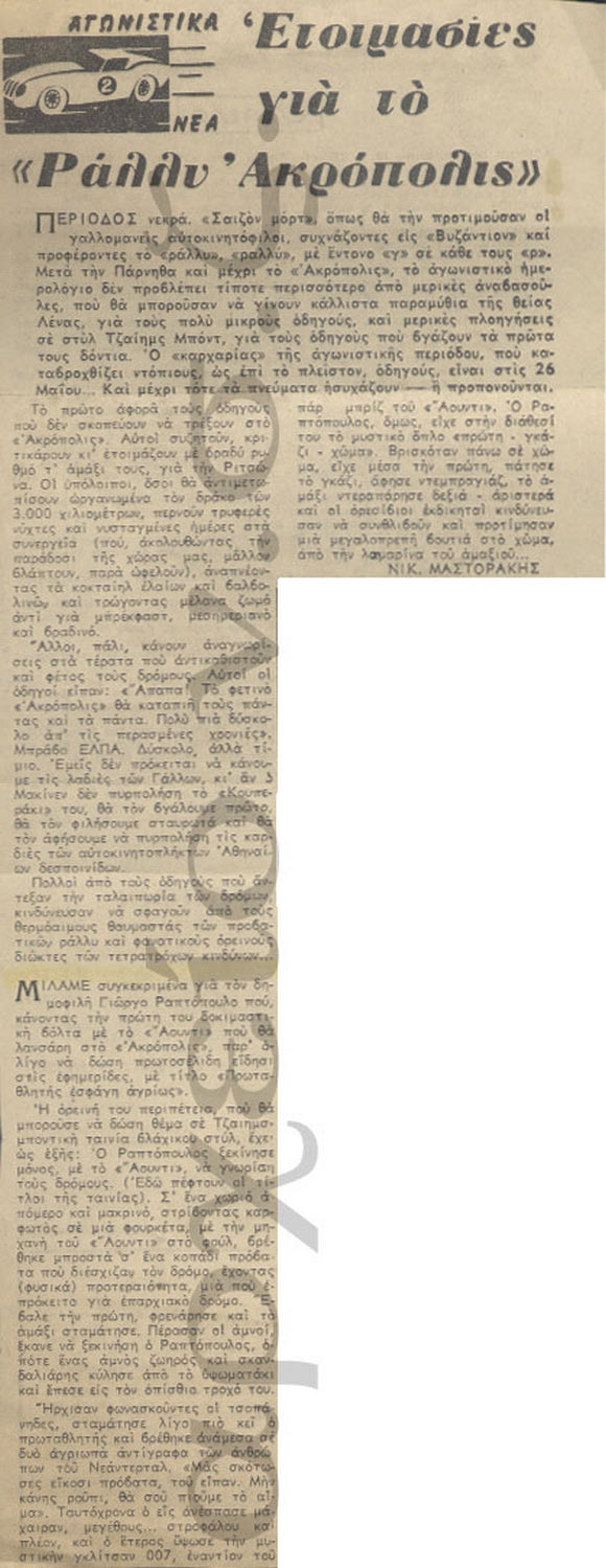 Όλως τυχαίως, ψάχνοντας για κάτι άλλο, έπεσε στα χέρια μου απόκομμα εφημερίδας από τον Μάιο του ’66. Αναφέρεται, όπως μαρτυρά ο τίτλος του, στις «Ετοιμασίες για το “Ράλυ” Ακρόπολις». Το υπογράφει ο Νίκος Μαστοράκης, με το πολύ προσωπικό του ύφος που το (και τον) αναδείκνυε, τότε, στις στήλες των εφημερίδων.