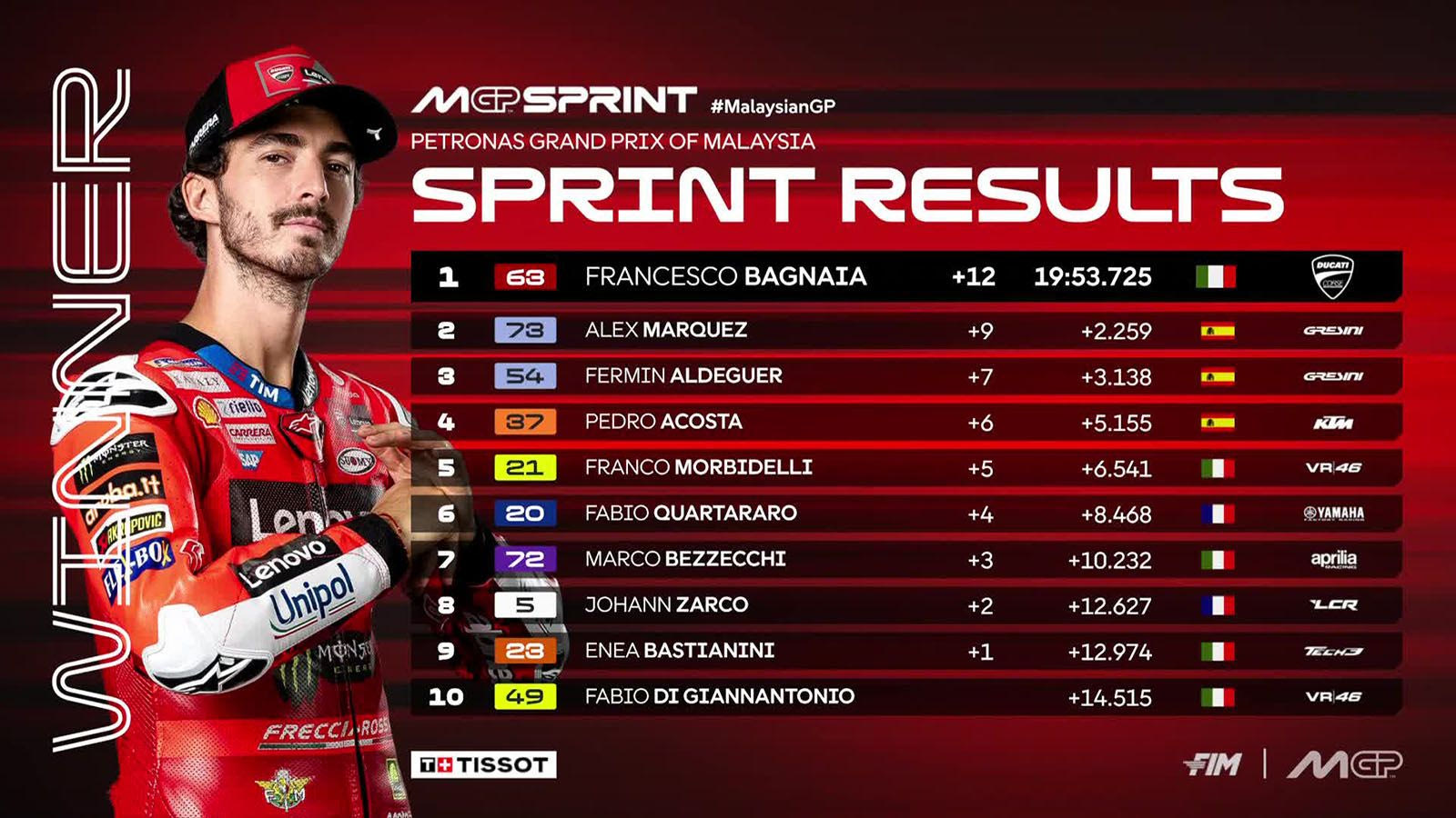 Μετά από μήνες δυσκολιών, αστάθειας και προβλημάτων να φέρει τη Ducati στα μέτρα του, ο παλιός καλός Πέκο Μπανάια επέστρεψε για να διαλύσει τον ανταγωνισμό στον αγώνα Sprint του MotoGP της Σεπάνγκ. Δεύτερος ο Άλεξ Μάρκεζ, που εξασφάλισε πλέον την ίδια θέση στο πρωτάθλημα.