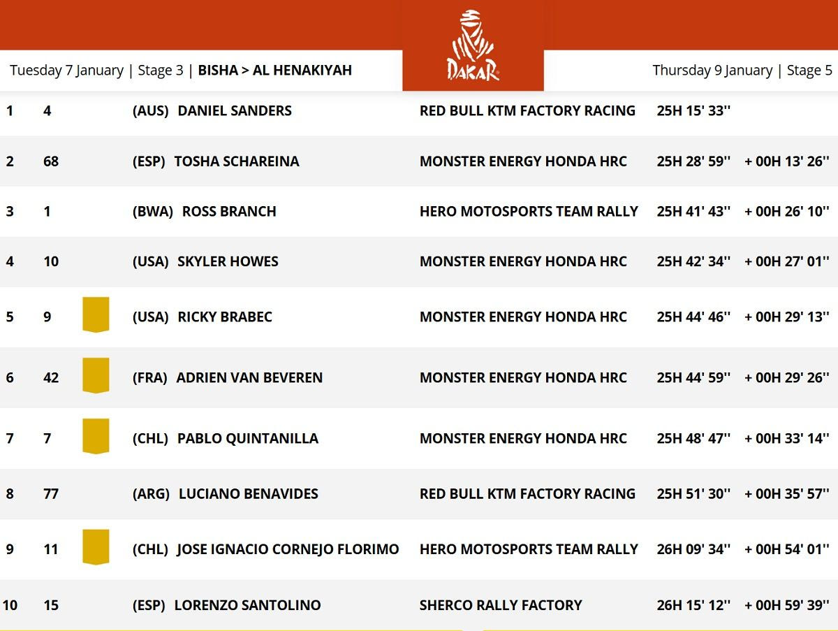 Από την άλλη, ο Αμερικανός, περσινός νικητής του Ντακάρ, δήλωσε πως “αν υπάρχει κάτι που με κάνει χαρούμενο είναι ότι είμαι ακόμα στον αγώνα και η μοτοσικλέτα μου παραμένει ένα κομμάτι”. Αντίστοιχα, προς το τέλος και ο Μπραντς έχασε πολύ χρόνο, και τερμάτισε περίπου 20 λεπτά πίσω, όπως ακριβώς και ο Σκάιλερ Χάους.