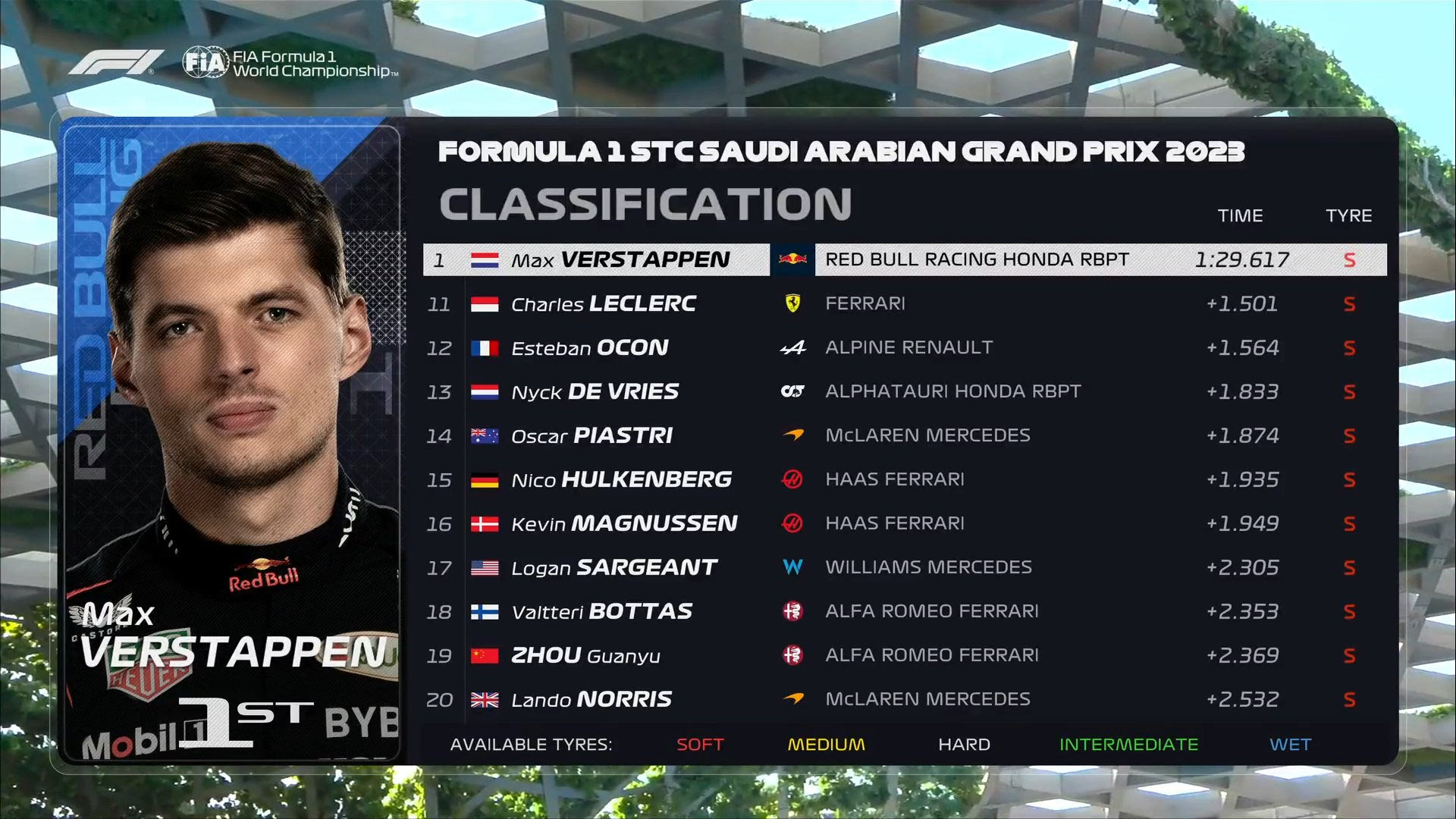 Ο Φερστάπεν, που καθυστέρησε να φτάσει στη Τζέντα λόγω ίωσης που τον ταλαιπωρούσε τις προηγούμενες μέρες, βγήκε στην πίστα μετά το πρώτο εικοσάλεπτο της ωριαίας διαδικασίας και έκανε μια σειρά από εκθαμβωτικούς γύρους. Προς το τέλος επανέλαβε το εγχείρημα, κατεβάζοντας το χρονόμετρο στο τελικό 1:29.662, για να διαμορφώσει την τεράστια διαφορά του από τον Πέρεζ.
