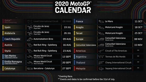 Το MotoGP ανακοίνωσε το καλεντάρι για τη φετινή σεζόν, με τον πρώτο αγώνα της χρονιάς να διεξάγεται στις 19 Ιουλίου επί ισπανικού εδάφους.