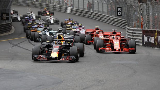 Red Bull driver Daniel Ricciardo of Australia, left, leads at the start and followed by Ferrari driver Sebastian Vettel of Germany, right and Mercedes driver Lewis Hamilton of Britain during the Formula One race, at the Monaco racetrack, in Monaco, Sunday, May 27, 2018. (AP Photo/Luca Bruno)