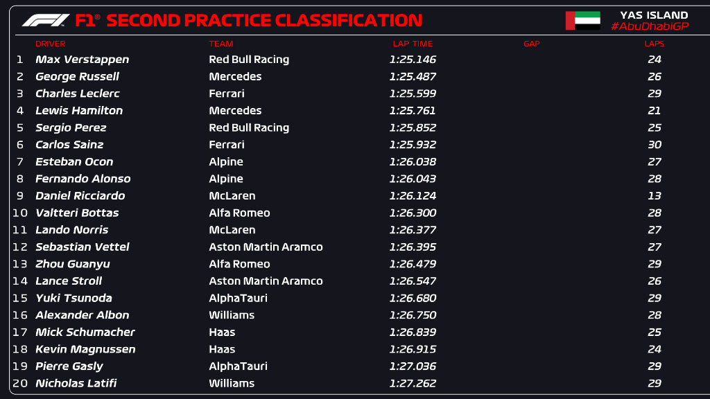 Ο Μαξ Φερστάπεν έγραψε τον ταχύτερο γύρο της πρώτης ημέρας στο Άμπου Ντάμπι, με χρόνο 0,34'' ταχύτερο του Τζορτζ Ράσελ της Mercedes και 0,45'' του Σαρλ Λεκλέρ της Ferrari στη δεύτερη περίοδο ελεύθερων δοκιμών στη Γιάς Μαρίνα.