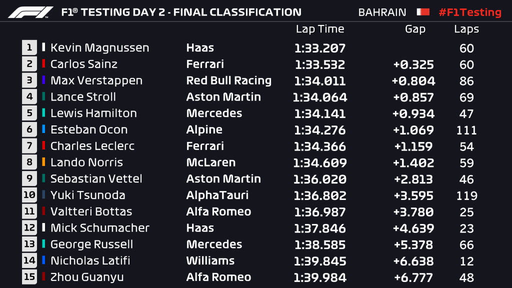 Ο ταχύτερος χρόνος του Δανού επετεύχθη στην έξτρα ώρα που δόθηκε από τη FIA στη Haas μετά το τέλος των κανονικών σημερινών δοκιμών, κατά την οποία ο Μάγκνουσεν βρισκόταν μόνος του στην πίστα – διότι χθες το πρωί η ομάδα καθυστέρησε εξαιτίας ενός προβλήματος στις μεταφορές που δεν ήταν δικής της υπαιτιότητας. Ως τότε ο Μάγκνουσεν, που αντιμετώπισε και ένα πρόβλημα στην εξάτμιση της VF-22, ήταν πανω από ένα 1,3” ταχύτερος από τον Μικ Σουμάχερ.
