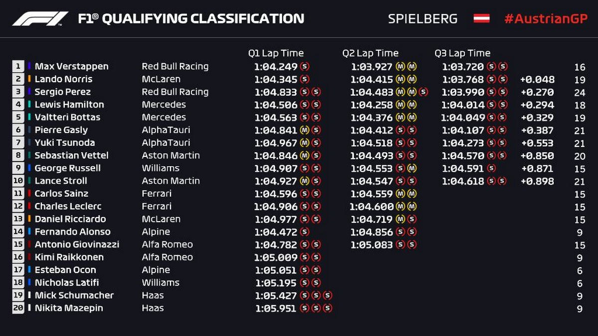 Ο Νόρις, σημειώνοντας τον ταχύτερο γύρο του τριημέρου στον πρώτο τομέα της πίστας με τη McLaren, βελτίωσε το χρόνο του στη δεύτερή του προσπάθεια στο Q3. Παρότι ο Φερστάπεν δεν έκανε το ίδιο, ο Ολλανδός με την RB16B-Honda παρέμεινε στην κορυφή χάρη στο 1:03.720 που πέτυχε στην πρώτη του προσπάθεια.