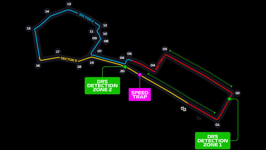 - Εδώ υπάρχουν δυο ζώνες DRS. Η ευθεία της πίστας θεωρείται η “Μέκκα” του slipstreaming, με ταχύτητες που μπορεί να ξεπερνούν τα 350 km/h, πριν την πολύ φαρδιά Στροφή 1 των 90 μοιρών που ακολουθεί και προσφέρει συνήθως μπόλικη δράση. Το 2016 ο Βάλτερι Μπότας που τότε οδηγούσε για τη Williams, έφτασε σε τελική ταχύτητα τα 378 km/h. Πρόκειται για ανεπίσημο ρεκόρ της Formula 1 που κρατά ως και σήμερα.