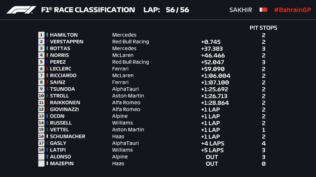 Όσο για τον Σεμπάστιαν Φέτελ, όλα πήγαν στραβά στο ντεμπούτο του με την Aston Martin. Εκκίνησε τελευταίος, έπειτα από ποινή 5 θέσεων επειδή αγνόησε κίτρινες σημαίες στις κατατακτήριες, και έπειτα στον αγώνα συγκρούστηκε με τον Εστεμπάν Οκόν και δέχθηκε ποινή 10 δευτερολέπτων, για να τερματίσει προτελευταίος, μπροστά μόνο από τον Μικ Σουμάχερ – και ενώ ο Νικίτα Μαζεπίν της άλλης Haas έχασε τον έλεγχο στη 2η στροφή και έβγαλε για τους 4 πρώτους γύρους το Όχημα Ασφαλείας.