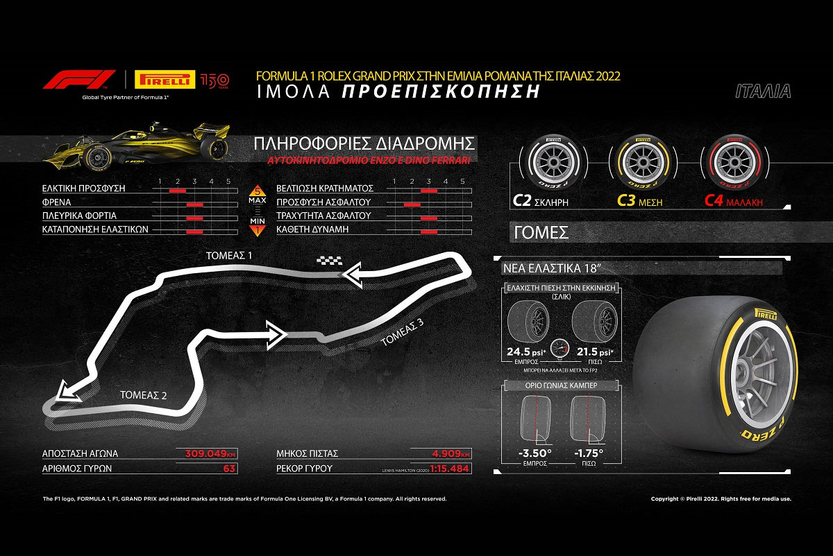 - Για το Γκραν Πρι της Εμίλια Ρομάνα η Pirelli επέλεξε τις μεσαίες γόμες της γκάμας C2, C3 και C4: P Zero λευκή/σκληρή, P Zero κίτρινη/μέση και P Zero κόκκινη/μαλακή αντίστοιχα. Πρόκειται για τον ίδιο συνδυασμό γομών που είχε γίνει και πέρυσι στην Ίμολα παρότι οι γόμες είναι διαφορετικές στην νέα γενιά ελαστικών 18 ιντσών. Θυμίζουμε πως οι κανονισμοί των ελαστικών είναι ίδιοι με πέρυσι: Αντί για 13 σετ θα είναι διαθέσιμα 12 σετ ελαστικών. Αυτά περιλαμβάνουν 2 σετ P Zero λευκής/σκληρής γόμας, τέσσερα σετ P Zero κίτρινης/μέσης γόμας και έξι σετ P Zero κόκκινης/μαλακής γόμας. Επιπρόσθετα οι ομάδες έχουν στη διάθεσή τους έξι σετ Cinturato πράσινα ενδιάμεσα ελαστικά και τρία σετ Cinturato μπλε βρόχινα ελαστικά που θα είναι διαθέσιμα σε περίπτωση βροχής.