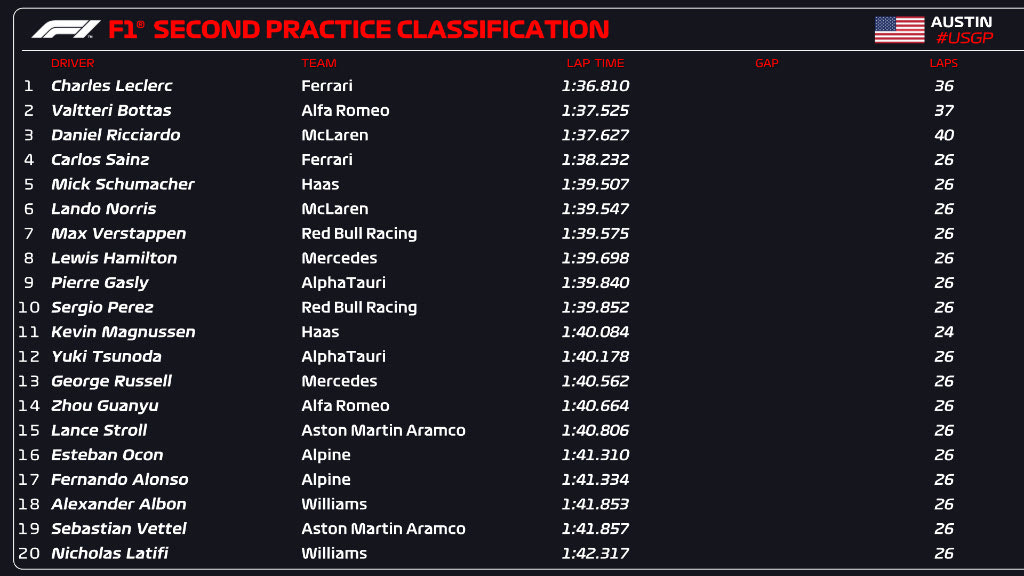 Οι Σαρλ Λεκλέρ, Βάλτερι Μπότας και Ντάνιελ Ρικιάρντο σημείωσαν τους τρεις ταχύτερους γύρους στη δεύτερη περίοδο ελεύθερων δοκιμών του GP ΗΠΑ - ενώ όλοι οι άλλοι δοκίμαζαν τα πειραματικά ελαστικά της Pirelli για το 2023.