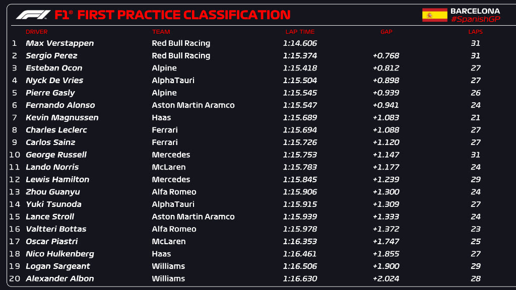 Ο Μαξ Φερστάπεν και η RBR επιβεβαίωσαν τα προγνωστικά που τους θέλουν απολύτως κυρίαρχους στο 7ο φετινό GP της Formula 1, λόγω των αεροδυναμικών χαρακτηριστικών της πίστας της Βαρκελώνης, συνθλίβοντας τον ανταγωνισμό στην πρώτη περίοδο των ελεύθερων δοκιμών του ισπανικού αγώνα.