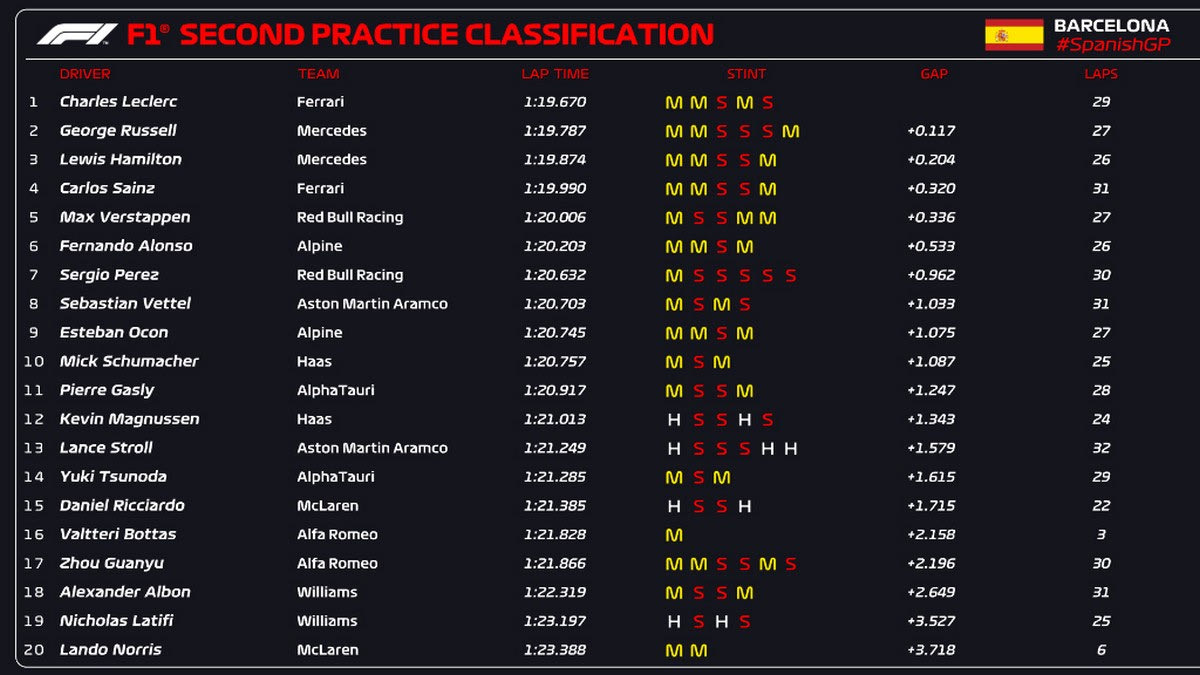 Όπως συνηθίζεται στις δεύτερες ελεύθερες δοκιμές των αγώνων της Formula 1, έτσι και στις σημερινές του 6ου γύρου του φετινού πρωταθλήματος –στη Βαρκελώνη της Ισπανίας– σχεδόν όλοι οι πρωτοπόροι σημείωσαν τους ταχύτερους τους γύρους με τη μαλακή γόμα περί το μέσον της ωριαίας διαδικασίας.