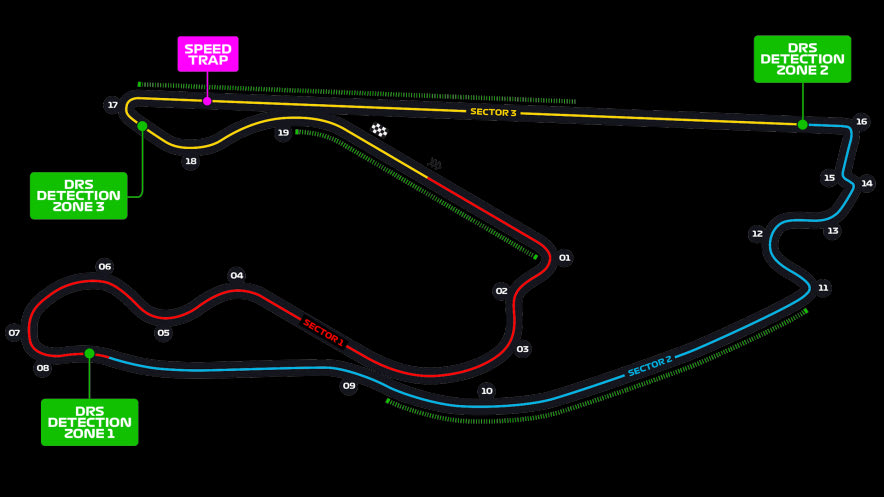 3. Υπάρχουν 3 ζώνες DRS, ενώ οι οδηγοί κινούνται με τέρμα γκάζι περίπου στο 58% του γύρου. Ο στροφές 11 και 17 είναι σημεία που ευνοούν τα προσπεράσματα, με το DRS να βοηθά σημαντικά σε αυτό.