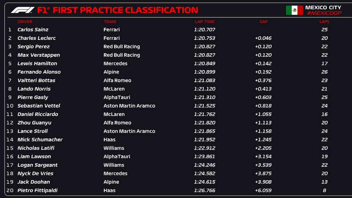 Ο Κάρλος Σάινθ και ο Σαρλ Λεκλέρ χωρίστηκαν από 46 χιλιοστά με τις δύο Ferrari F1-75 στην κορυφή της πρώτης περιόδου ελεύθερων δοκιμών του GP Μεξικού, με διαφορά 0,120'' από τις δύο Red Bull των Πέρεζ και Φερστάπεν που σημείωσαν πανομοιότυπο χρόνο.