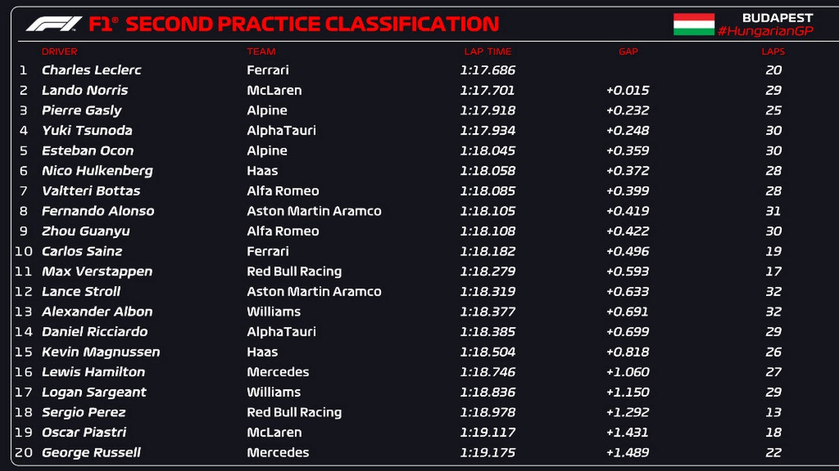 Ο Σαρλ Λεκλέρ της Ferrari και ο Λάντο Νόρις της McLaren ήταν οι πρωτγωνιστές της δεύτερης περιόδου ελεύθερων δοκιμών του GP της Βουδαπέστης. Την πρώτη τριάδα έκλεισε ο Πιέρ Γκασλί της Alpine, εκτός δεκάδας οι Φερστάπεν-Πέρεζ της Red Bull.