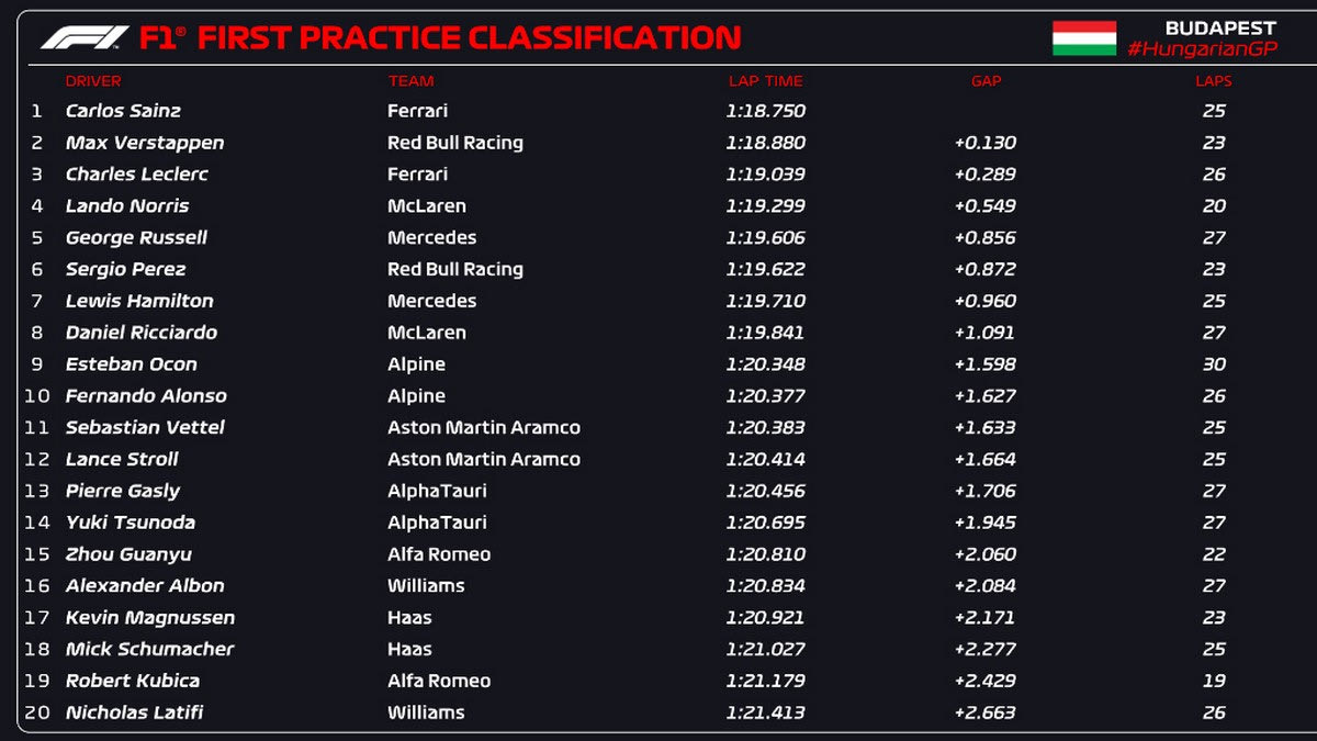 Στην πρώτη ωριαία διαδικασία των ελεύθερων δοκιμών στην πίστα της Βουδαπέστης, οι οδηγοί και οι ομάδες αφοσιώθηκαν κυρίως στην κατανόηση και διαχείριση των ελαστικών στις συνθήκες καύσωνα που επικρατούσαν – και προς το τέλος με τον ταχύτερό του γύρο ο Κάρλος Σάινθ εκθρόνισε τον Μαξ Φερστάπεν και τη RBR από την κορυφή των χρόνων, με τη μαλακή γόμα.