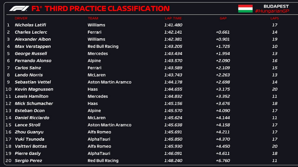 Ήταν διαφορές ενδεικτικές των εναλλασσόμενων συνθηκών, και της βελτίωσης της πρόσφυσης της ιδανικής γραμμής στο τέλος της τρίτης αυτής περιόδου των δοκιμών – όταν και ο Λατίφι πέτυχε τον ταχύτερο χρόνο. Αν ο καιρός παραμείνει βροχερός, τότε οι δοκιμές κατάταξης του GP Ουγγαρίας σήμερα στις 17:00 το απόγευμα αναμένεται να μεταμορφωθούν σε λοταρία.