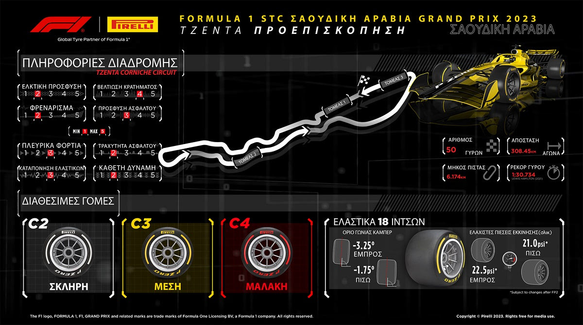 - Η Pirelli επέλεξε για την Σαουδική Αραβία την C2 ως P Zero λευκή σκληρή γόμα, την C3 ως P Zero κίτρινη μέση γόμα και την C4 ως P Zero κόκκινη μαλακή γόμα.