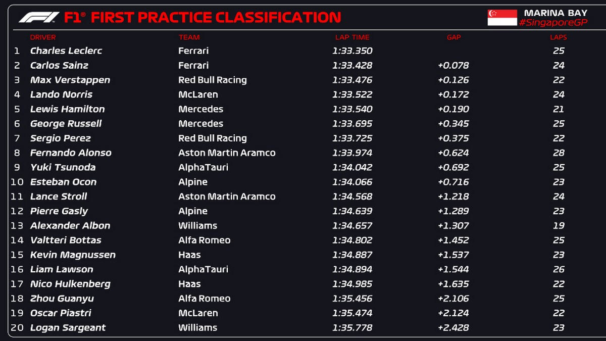 Ο Σαρλ Λεκλέρ σημείωσε τον πρώτο χρόνο στις εναρκτήριες ελεύθερες δοκιμές του GP Σιγκαπούρης, με 78 χιλιοστά διαφορά από τον Κάρλος Σάινθ και 0,12'' από τον Μαξ Φερστάπεν. Τρεις φορές μεγαλόσωμες σαύρες διέσχισαν την πίστα και διέκοψαν την ομαλή ροή των δοκιμών.
