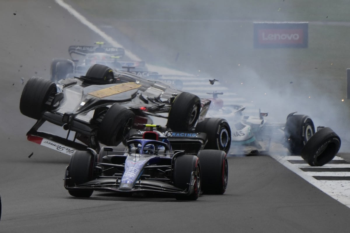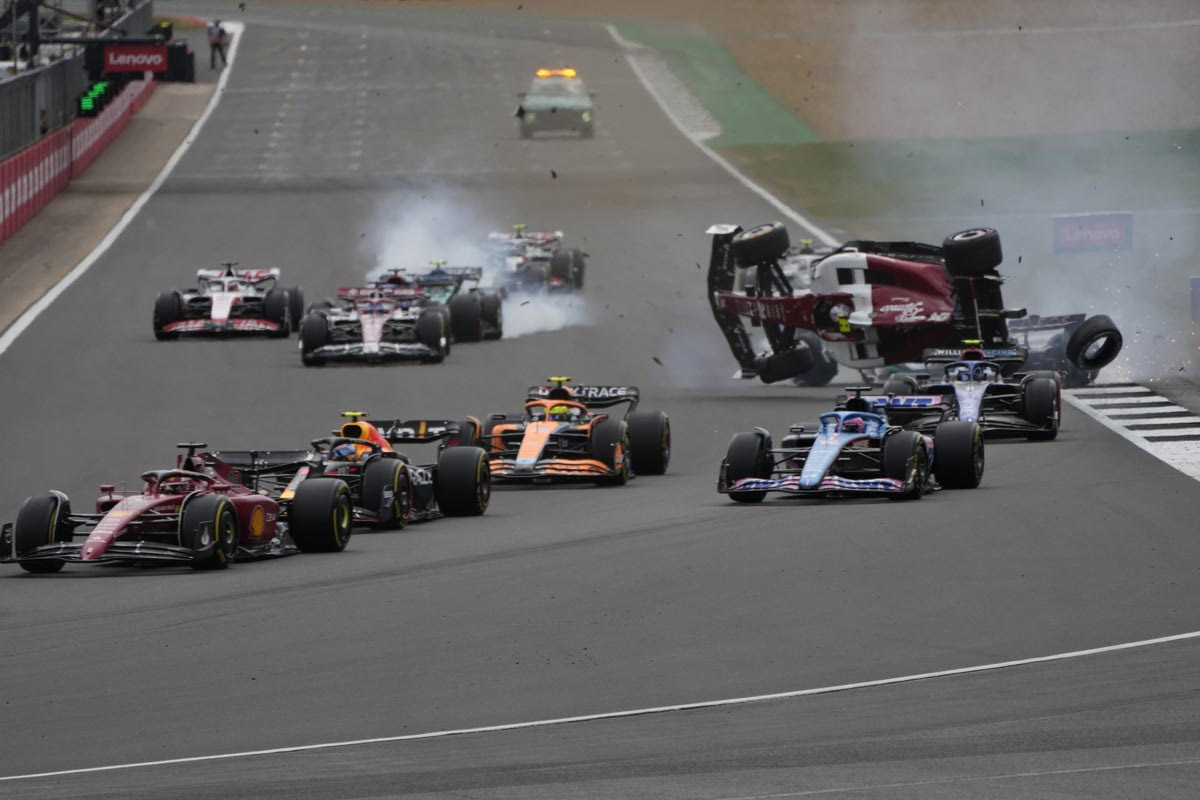Alfa Romeo driver Guanyu Zhou of China crashes at the start of the British Formula One Grand Prix at the Silverstone circuit, in Silverstone, England, Sunday, July 3, 2022. (AP Photo/Frank Augstein)