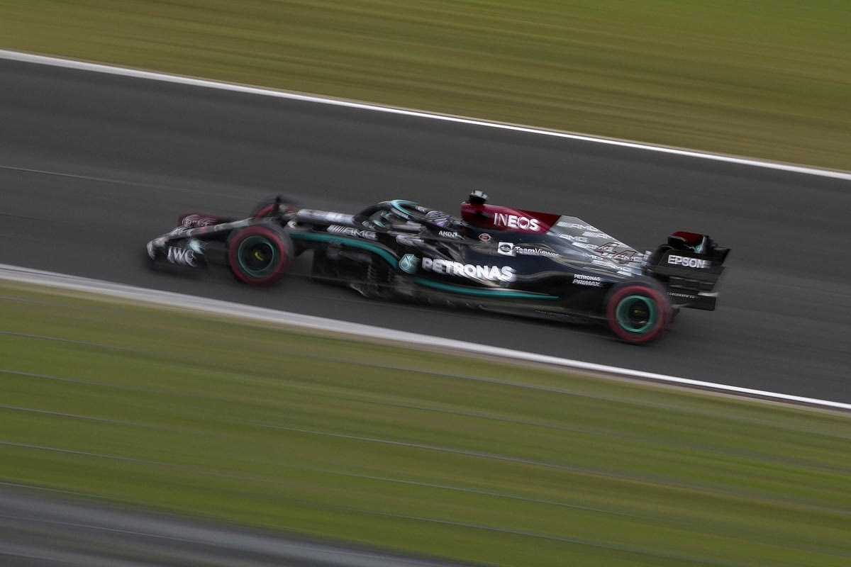 Mercedes driver Lewis Hamilton of Britain steers his car during the first practice session ahead of Sunday's Formula One Turkish Grand Prix at the Intercity Istanbul Park circuit in Istanbul, Turkey, Friday, Oct. 8, 2021.(AP Photo/Francisco Seco)