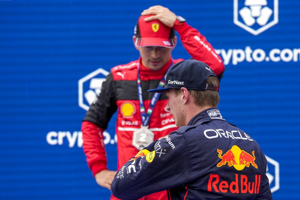 Red Bull driver Max Verstappen of the Netherlands , right, walks past Ferrari driver Charles Leclerc of Monaco after they clocked respectively the fastest and second time during sprint race at the Enzo and Dino Ferrari racetrack, in Imola, Italy, Saturday, April 23, 2022. The Italy's Emilia Romagna Formula One Grand Prix will be held on Sunday. (AP Photo/Luca Bruno)