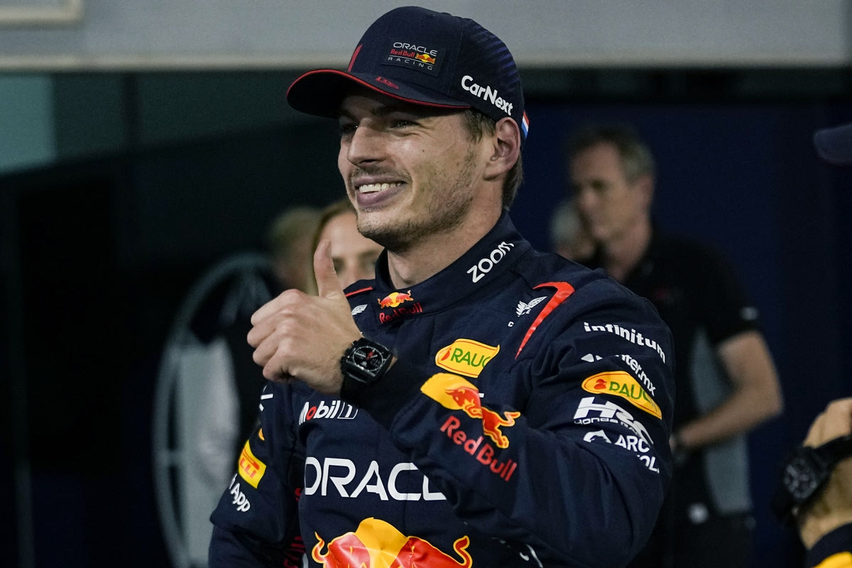 Red Bull driver Max Verstappen of the Netherlands reacts as he finishes at pole position during the Formula One qualifying at the Bahrain International Circuit in Sakhir, Bahrain, Saturday, March 4, 2023. The Bahrain GP will be held on Sunday March 5, 2023.(AP Photo/Frank Augsten)