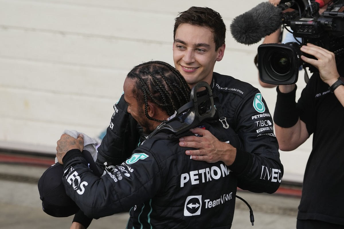 Mercedes driver Lewis Hamilton, of Britain, front, congratulates teammate George Russell, of Britain, after winning the Sprint Race qualifying session at the Interlagos racetrack, in Sao Paulo, Brazil, Saturday, Nov. 12, 2022. The Brazilian Formula One Grand Prix will take place on Sunday. (AP Photo/Andre Penner) AP